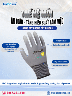Găng tay chống cắt AP1503 – thế hệ mới với sợi Adamas & phủ PU linh hoạt. Chống cắt vượt trội, thoải mái, bền bỉ. Giá sỉ tận xưởng tại GMGGloves.