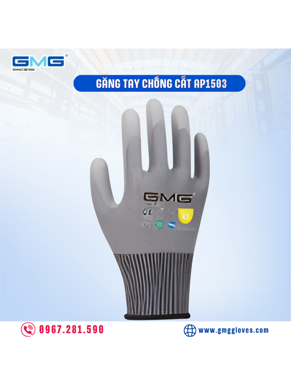 Găng tay chống cắt AP1503 – thế hệ mới với sợi Adamas & phủ PU linh hoạt. Chống cắt vượt trội, thoải mái, bền bỉ. Giá sỉ tận xưởng tại GMGGloves.